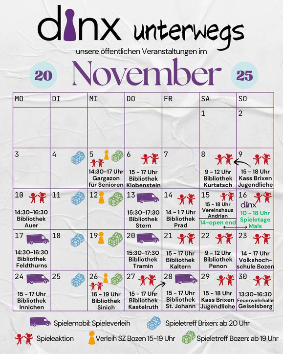 Das Spielemobil ist voll beladen mit einer Vielzahl an Brett- und Kartenspielen und besucht zählige Vereine und Bibliotheken in ganz Südtirol. Im folgenden findet